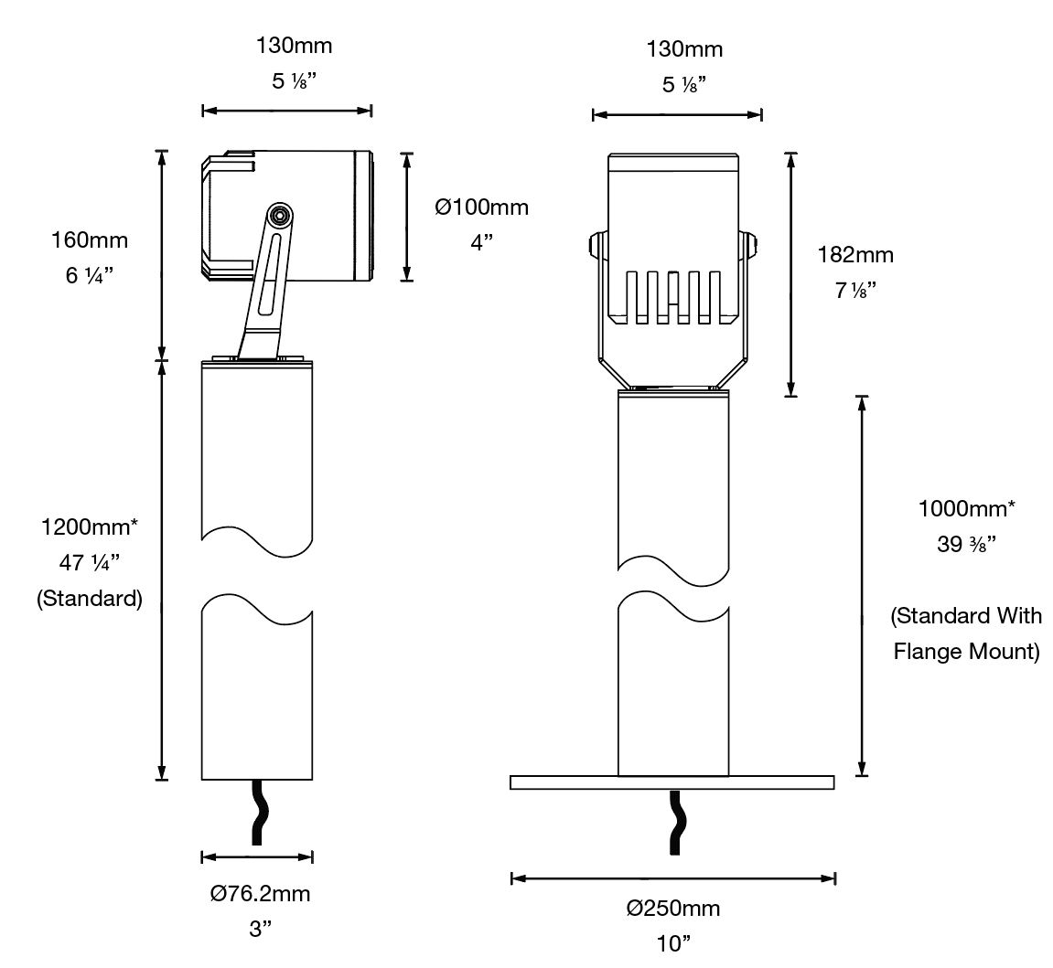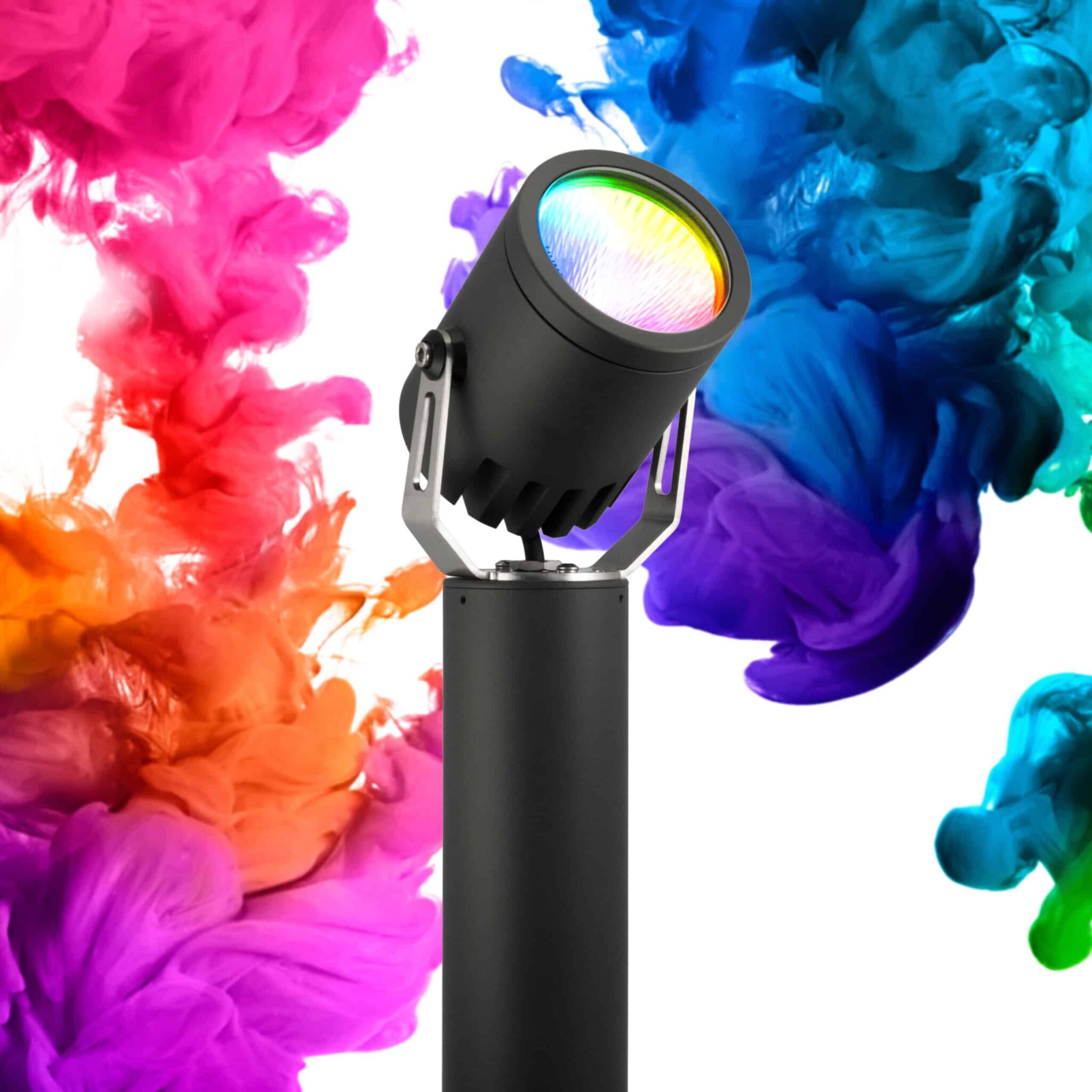 The Ultra 35 RGBW Pole Spot has been designed to be mounted on horizontal surfaces. It can be used for wall washing, to provide directional light and to highlight architectural features and structural elements. It has a fully adjustable head allowing 360 degrees rotation and 0-120 degrees elevation and can be fixed in place using the inbuilt locking mechanism. The pole height can be specified, as required, up to 2 metres 6ft 6″.